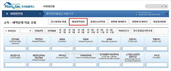 귀속년도 소득 세액 공제 자료를 조회할 수 있습니다. 각 항목들을 클릭해 소득 세액 공제 자료를 확인합니다. 다음 상단에 있는 예상세액계산을 클릭합니다.
